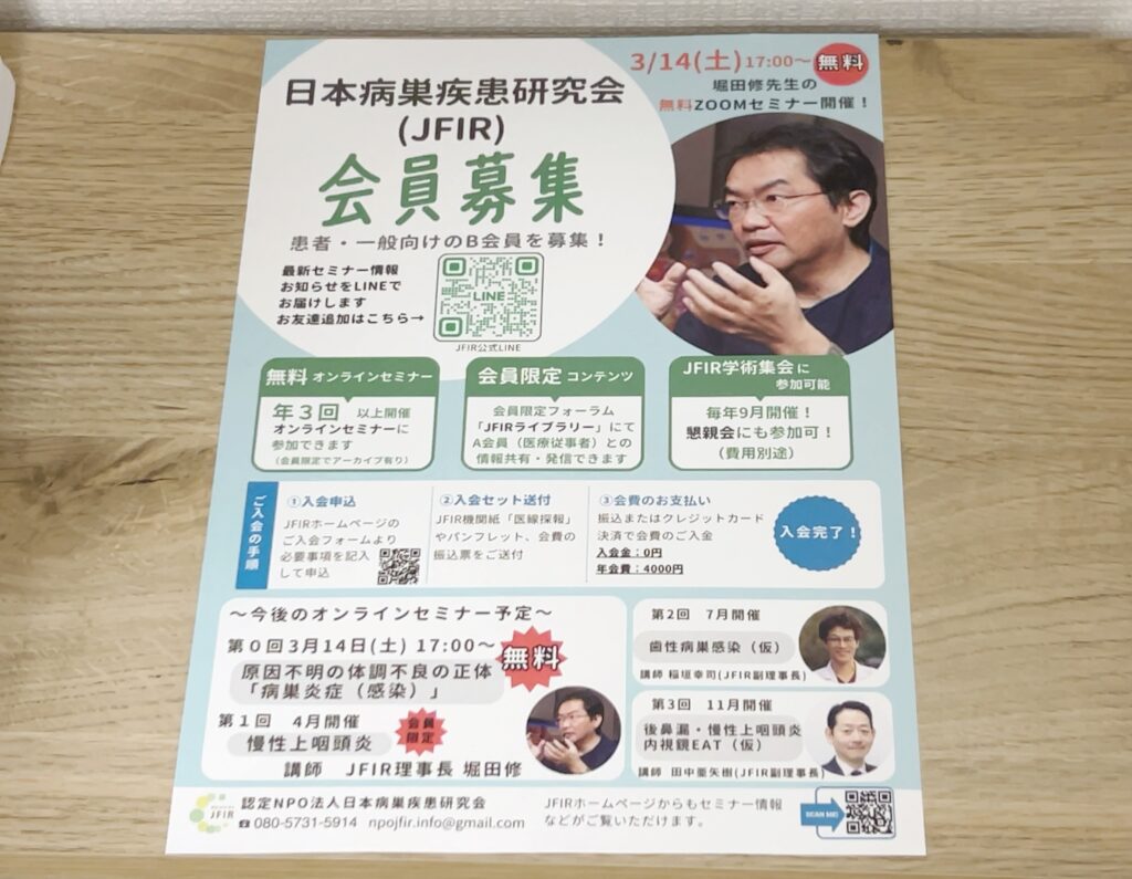 そういった考えから日本病巣疾患研究会(JFIR)に所属し、医師・歯科医師の先生方をはじめ、慢性上咽頭炎の治療に関わる専門家の方々の知見に触れる機会を持つようにしています。