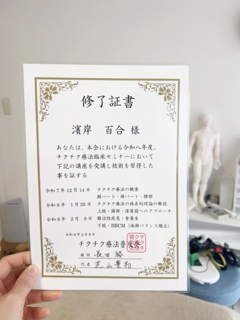 このたび、チクチク療法臨床セミナーを受講し、修了証書をいただきました。