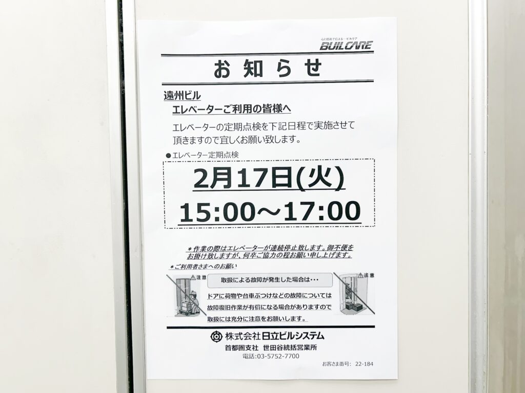 エレベーターが定期点検のため止まります(2月17日(火)15:00~17:00)
