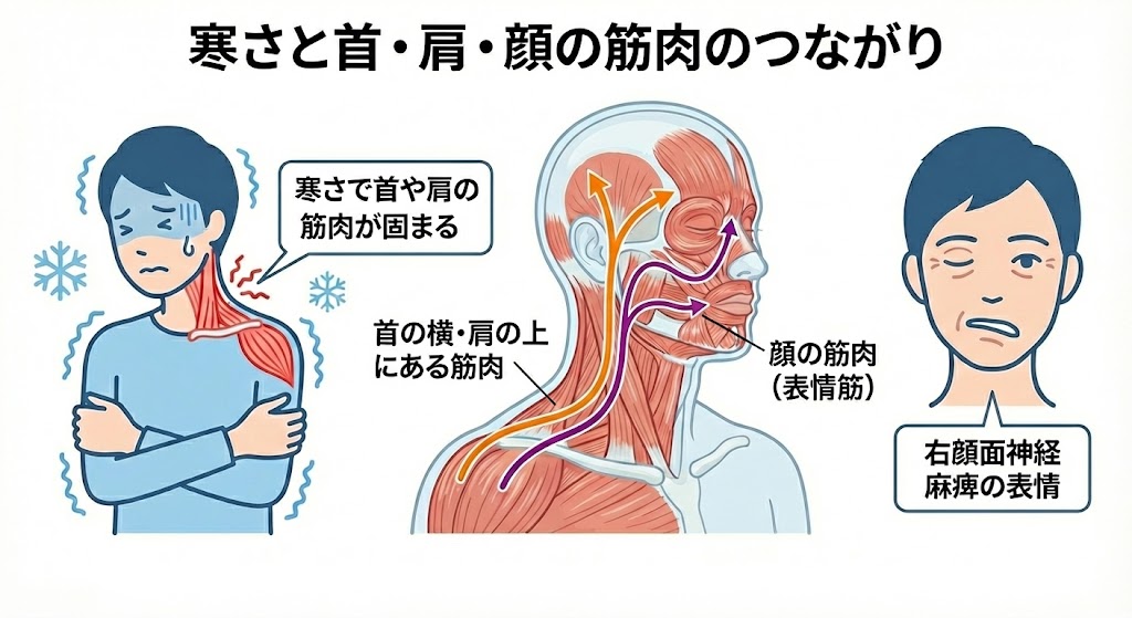 寒さで首や肩が固まると顔の動きまで影響が出るのは、体の作りを考えるとごく自然なことです。
