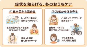今まさに動きが戻り始めている方も、後遺症として残っているこわばりに悩んでいる方も、冬のケアで意識することは変わりません。