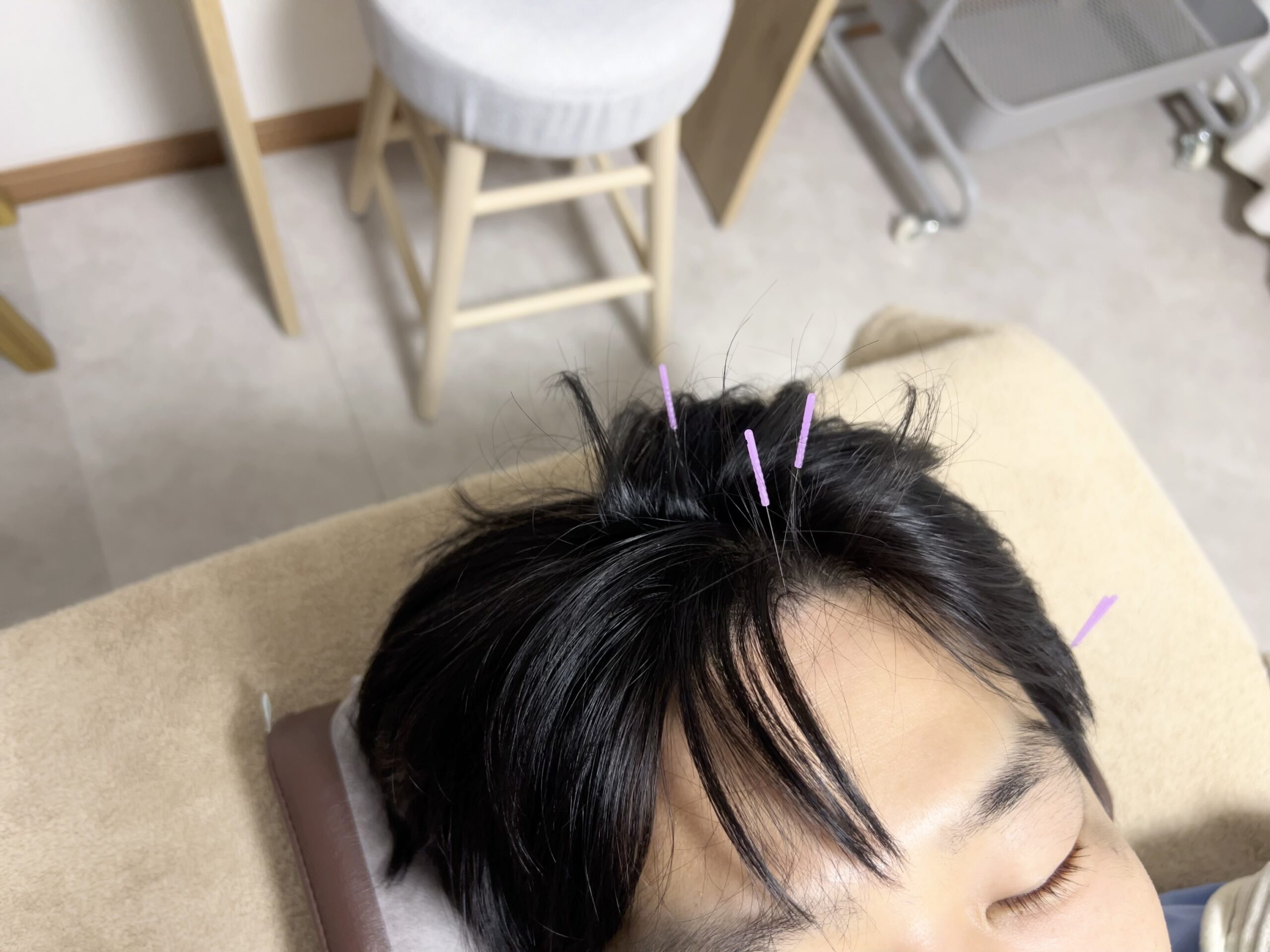 不調の内容を伺い、腕や首の診断点を確認しながら、頭部に鍼を数本使用します。
