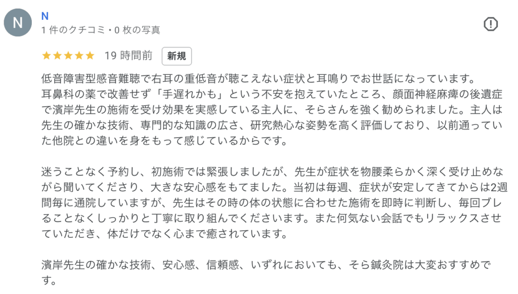 濱岸先生の確かな技術、安心感、信頼感、いずれにおいても、そら鍼灸院は大変おすすめです。(Nさま)